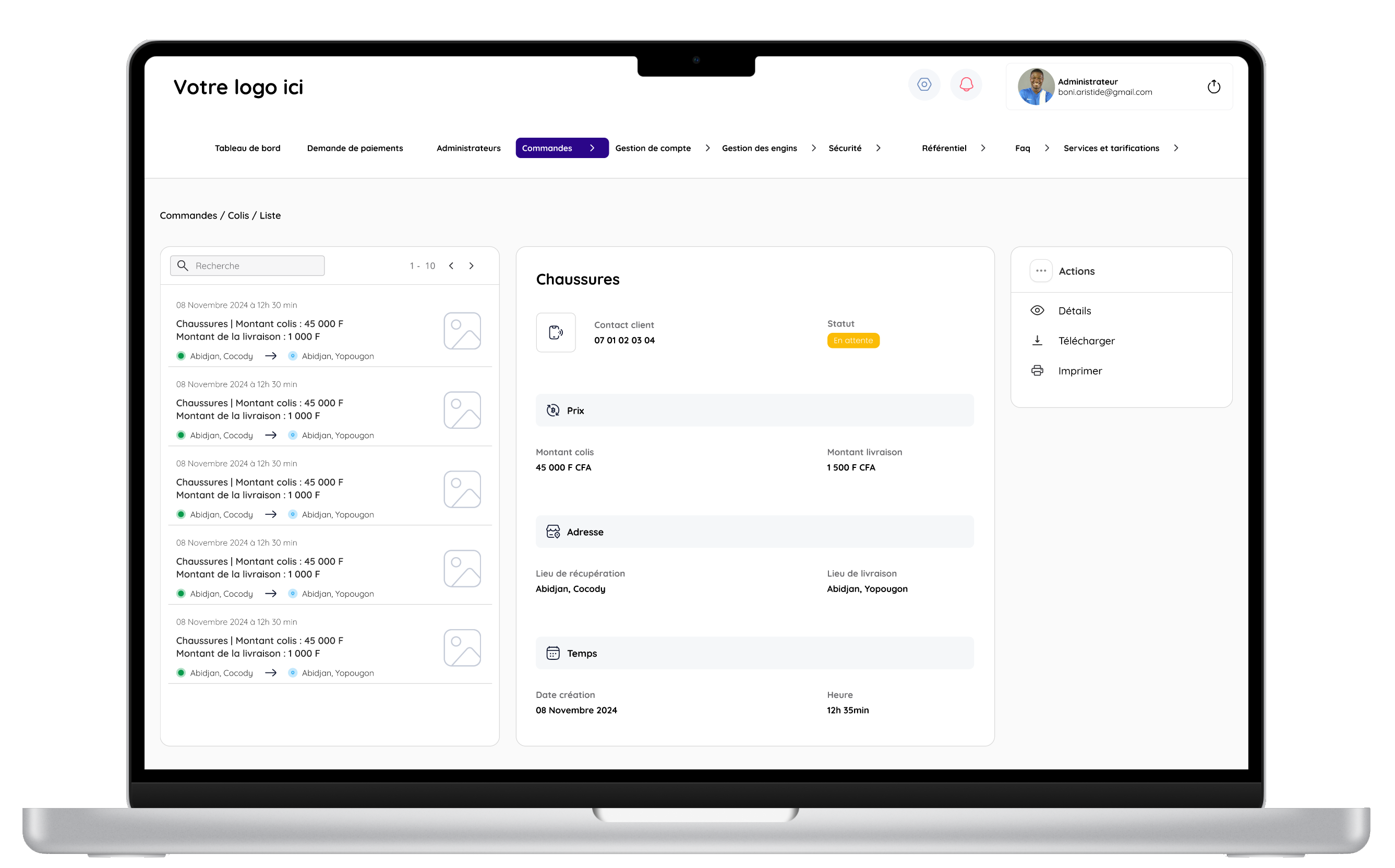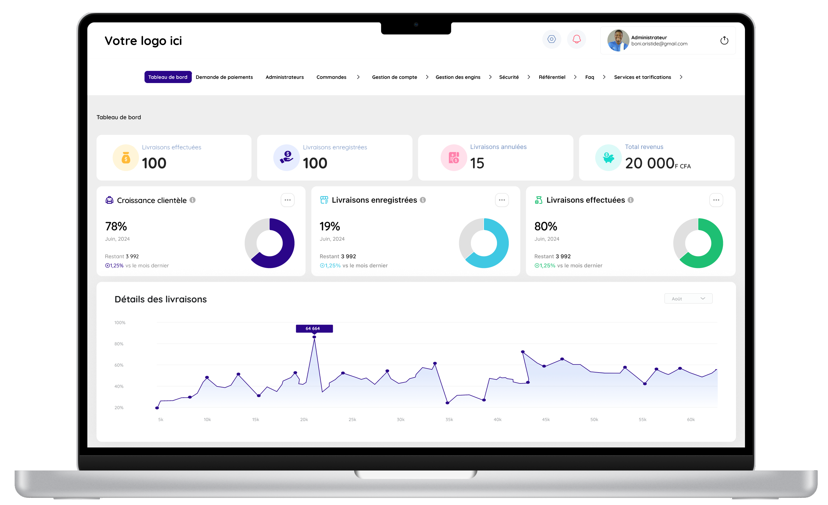 Un tableau de bord centralisé pour piloter l'ensemble de vos opérations : gestion des commandes, suivi des livraisons, rapports et analyses.